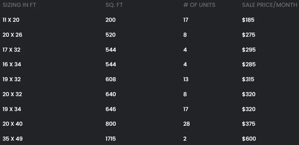 11 X 20 and 20 X 40 are our most popular units for storage.